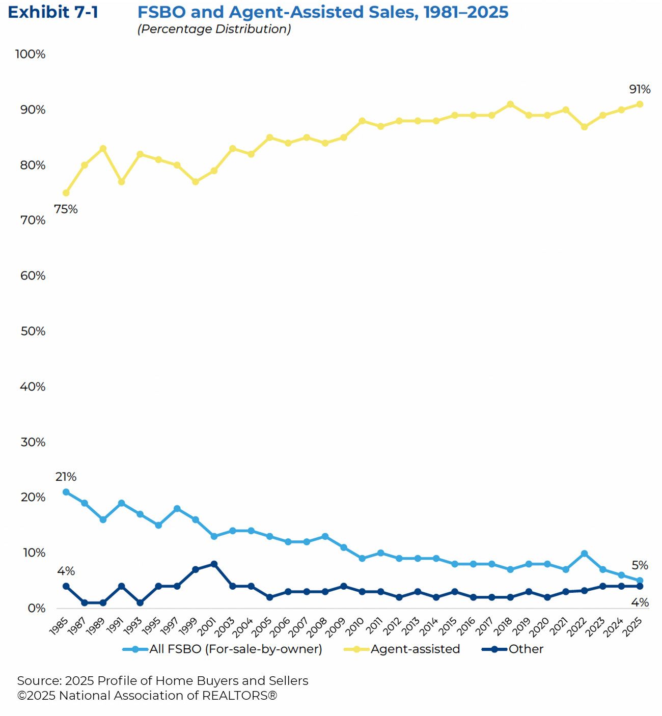 The latest NAR data shows FSBO (for sale by owner) home sales have fallen to an all-time low, making up just 5% of all transactions, which is a dramatic decline from the 21% share in the early 1980s. Nearly all sellers now prefer working with agents, reflecting a clear shift toward valuing expertise, efficiency, and risk reduction. Here are the forces causing the FSBO market to shrink: